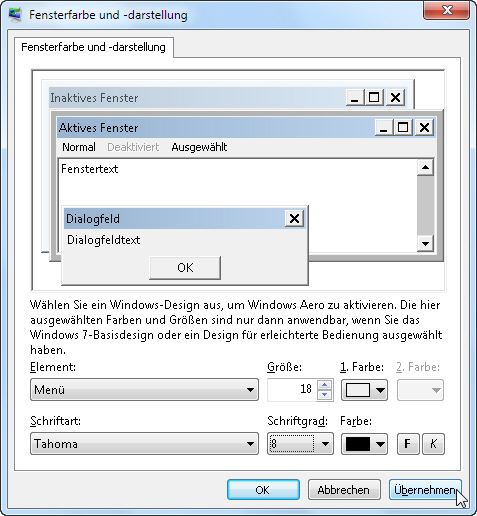 Über Start/Systemsteuerung/Darstellung und Anpassung/Anpassung/Fensterfarbe/Erweiterte Darstellungseinstellungen… die Einstellungen öffnen.- Dort jeweils bei allen Elementen mit Angabe der Schriftart die Schriftart von Segoe UI auf Tahoma ändern.