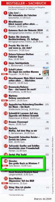 „Das große Buch zu Windows 7" erfreut sich seit seiner Veröffentlichung Ende September anhaltender Beliebtheit. Mit dem Markstart von Windows 7 im Oktober zogen die Verkaufszahlen so stark an, dass es sogar für Platz 19 in der aktuellen Sachbuch-Bestsellerliste gereicht hat, die vom Börsenblatt des deutschen Buchhandels gemeinsam mit Media Control und dem „Focus“ aus den Verkaufszahlen ermittelt wird. Die aktuelle Liste beim Börsenblatt (Stand 13.11.2009) wird sich in Zukunft auch wieder ändern. Deshalb füge ich noch einen Scan der Liste aus dem aktuellen „Focus“ als Beleg für später an.