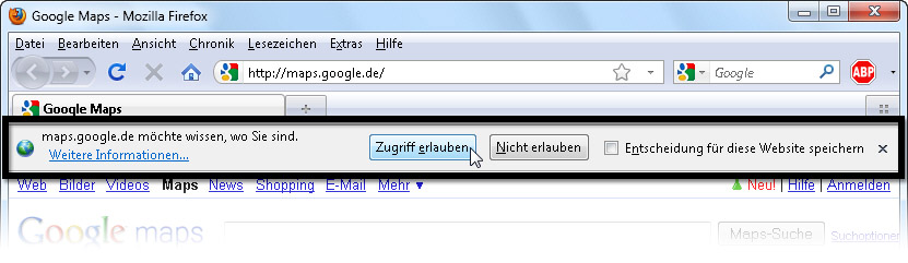 Aus Datenschutzgründen fragt Firefox jedes Mal nach, bevor diese Funktion ausgeführt wird. Dazu wird oben eine Hinweisleiste eingeblendet. Klicken Sie hier auf Zugriff erlauben um die Lokalisierung zuzulassen. Sollte die Leiste mal angezeigt werden, ohne dass Sie eine Lokalisierung angefordert haben oder wünschen, können Sie dies mit Nicht erlauben unterbinden. Mit der Option rechts daneben merkt sich Firefox Ihre Antwort für die aktuelle Webseite und fragt dann nicht mehr nach.