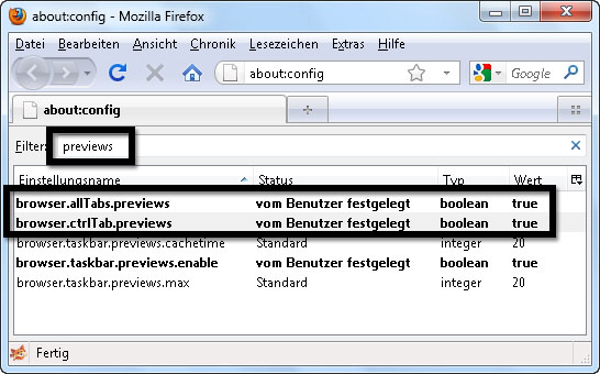 Geben Sie oben links im Feld Filter den Begriff previews ein. Die sehr umfangreiche Einstellungsliste unten reduziert sich dann auf einige wenige Einträge.- Suchen Sie hier die Einträge browser.allTabs.previews sowie browser.ctrlTab.previews und aktivieren Sie diese beiden jeweils mit einem Doppelklick. Bei beiden Einträgen sollte anschließend ganz rechts in der Spalte der Wert auf true stehen.
