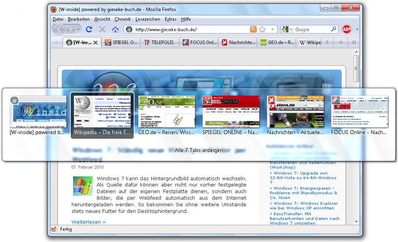 Wenn Sie nun [Strg]+ [Tab] benutzen, um zwischen den Tabs hin und her zu schalten, blendet Firefox eine Übersicht aller Tabs jeweils mit einer miniaturisierten Vorschau auf den Inhalt ein, was die Auswahl doch wesentlich leichter macht. Na gut, „aller Tabs“ stimmt nicht ganz. Ein Grund dafür, dass die Funktion noch nicht offiziell angeboten wird, liegt wohl darin, dass sie noch nicht unbegrenzt flexibel ist. Bei sechs Tabs nebeneinander ist Schluss, alle weiteren werden bislang ignoriert. Dass es durchaus anders geht, zeigt die Tab-Übersicht (siehe im Folgenden).