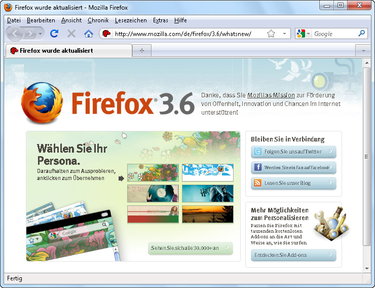 Ab sofort steht die neue Firefox-Version 3.6 zum Download bereit. Es handelt sich dabei um den ersten größeren Versionssprung seit einiger Zeit, bei dem das Update nicht nur Fehlerkorrekturen und Verbesserungen mitbringt, sondern auch wesentliche neue Funktionen. Es ist auch insofern bemerkenswert, als es vielleicht das letzte größere Update dieser Art sein wird. Nicht, weil die Entwicklung eingestellt werden soll, sondern weil in Zukunft öfter kleinere Updates (3.6.x) erscheinen sollen, die auch neue Funktionen mitbringen. Die Zeit der „dicken“ 3.x-Updates ist somit vielleicht vorbei. Aber ob und wie dies tatsächlich umgesetzt wird, muss die Zukunft zeigen. Wir bleiben am Ball.
