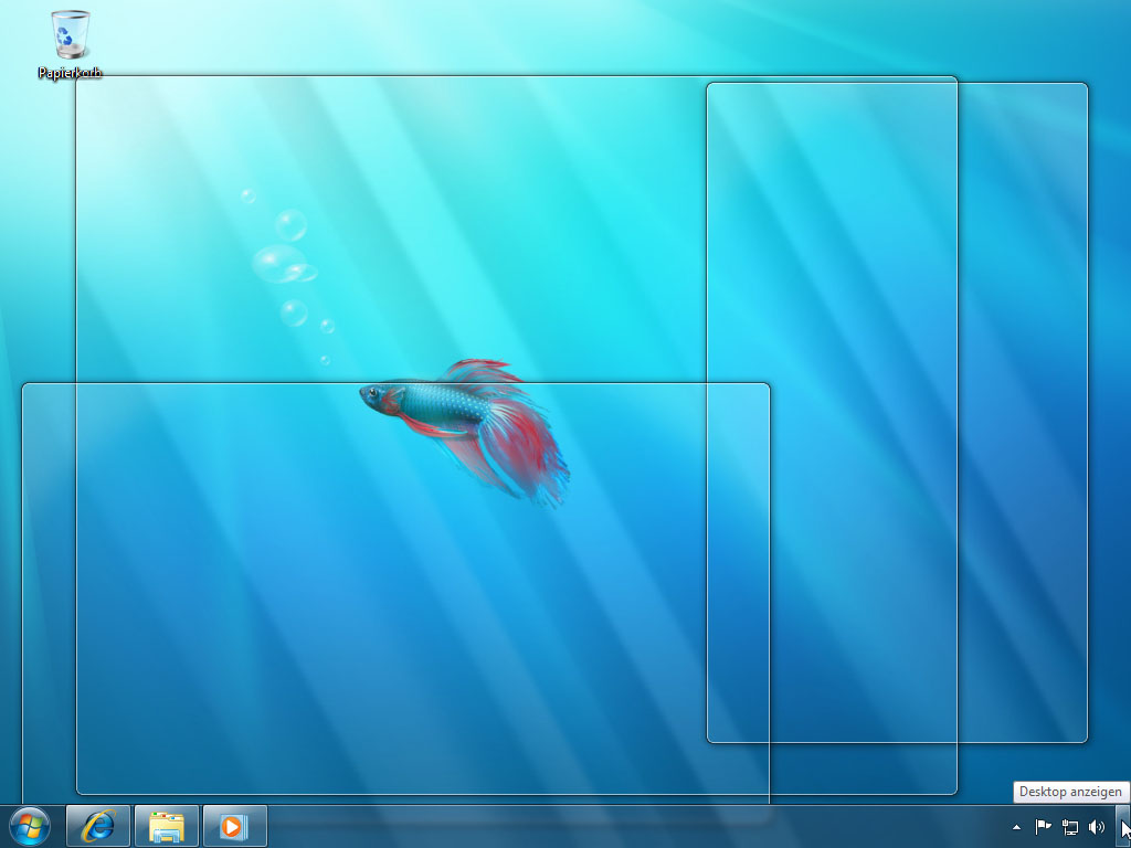 Windows 7 bringt einige interessante neue Desktopeffekte oder auch -spielereien mit. AeroPeek steht für ein kleines unscheinbares Feld ganz rechts im Infobereich. Bewegt man den Mauszeiger darauf, werden alle angezeigten Fenster ausgeblendet und deren Position und Größe stattdessen mit einem transparenten Rahmen veranschaulicht. Diese Funktion hilft vor allem Anwendern, die z. B. Gadgets auf dem Bildschirm platziert haben oder ein dynamisches Hintergrundbild mit Informationen verwenden. Dank AeroPeek lassen sich diese nun jederzeit einsehen. Bewegt man den Mauszeiger wieder von der Fläche weg, sind die Fenster sofort wieder sichtbar. Mit einem Klick auf diese Fläche im Infobereich lassen sich übrigens alle angezeigten Fenster minimieren.