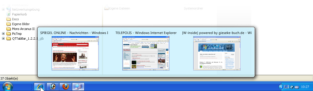 Der besondere Clou: Sogar die Echtzeitvorschau wurde realisiert: Wenn Sie den Mauszeiger auf einem der Symbole ruhen lassen, wird eine Minivorschau auf das entsprechende Fenster angezeigt. Gibt es mehrere Instanzen der Anwendung (z. B. mehrere gleichzeitig geöffnete Word-Dokumente oder mehrere Webseiten im Internet Explorer), dann werden wie bei Windows 7 auch mehrere Vorschauen angezeigt, unter denen Sie eine auswählen können. Einzige Einschränkung: ViGlance unterstützt in dieser Hinsicht keine Tabs bzw. Register, sondern nur mehrere geöffnete Fenster.