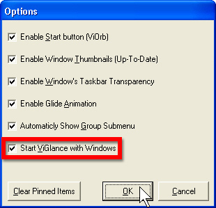 Sie können ViGlance hier herunterladen. Eine Installation ist nicht notwendig. Kopieren Sie einfach ViGlance OneStep.exe in ein Verzeichnis Ihrer Wahl. Wenn Sie es ausführen, finden Sie ein Symbol im Infobereich vor und die Startleiste ist sofort aktiv. Ein rechter Mausklick auf das Symbol im Infobereich öffnet das Kontextmenü. Dort können Sie die Options abrufen. Sie erlauben das Steuern der wichtigsten Funktionen. Unter anderem können Sie das Tool bei jedem Windows-Start automatisch aktivieren (Start ViGlance with Windows).