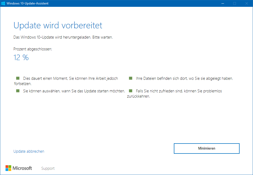 Der Assistent prüft dann, ob alle Voraussetzungen für das Update erfüllt sind und beginnt mit dem Herunterladen und Überprüfen der Daten. Währendessen können Sie das Fenster minimieren und ganz normal mit Ihrem PC weiterarbeiten.