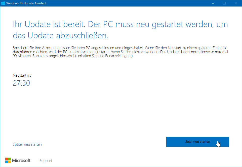 - Abschließend muss ein Neustart durchgeführt werden. Der erfolgt mit einiger Verzögerung automatisch. Sie können an dieser Stelle auch sofort Jetzt neu starten. Oder wenn es gerade nicht passt, das Update mit Später neu starten noch etwas herauszögern. Mit dem nächsten Neustart wird es dann automatisch durchgeführt.
