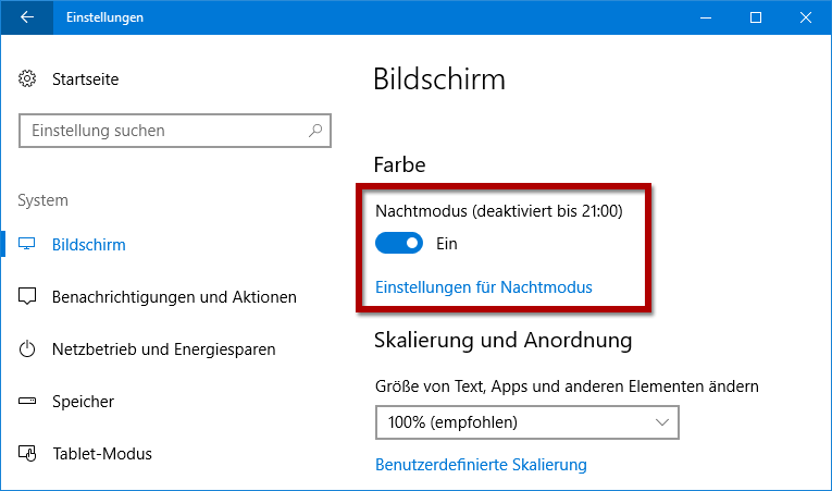 - Mit der Verknüpfung Einstellungen für Nachtmodus können Sie genauer festlegen wann und wie dieser Modus stattfinden soll.