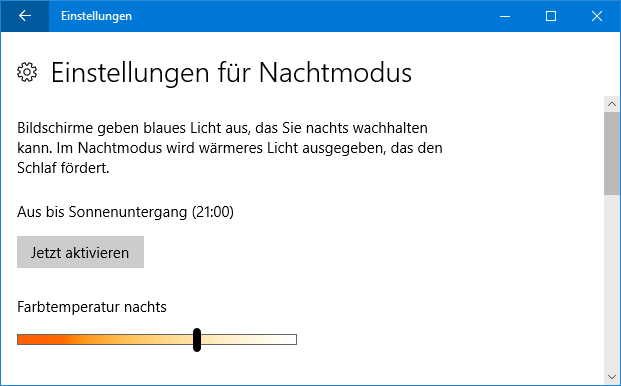 Wollen Sie den Nachtmodus einfach sofort einschalten, klicken Sie in den Einstellungen auf Jetzt aktivieren. Er wird dann verwendet, bis der gewählte Zeitplan (siehe im Folgenden) das Abschalten vorsieht.