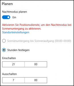 Weiter unten können Sie das automatische Ein- und Ausschalten des Nachtmodus planen. Dies kann zum einen mit Stunden festlegen nach starren Zeiten erfolgen.