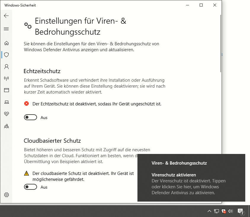 - Deaktivieren Sie hier die Schalter bei Echtzeitschutz und Cloudbasierter Schutz (wenn letzterer überhaupt eingeschaltet ist).