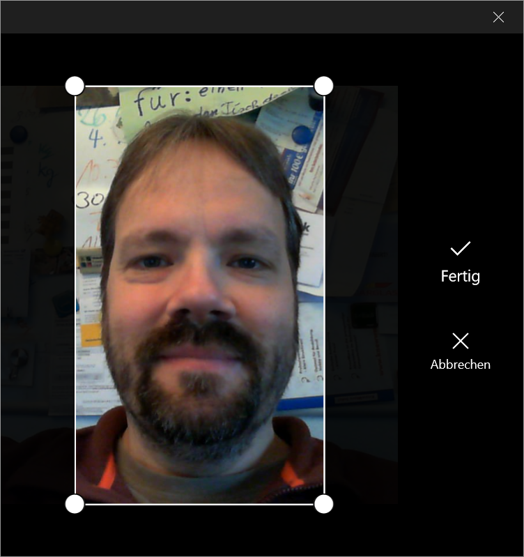 Wenn Sie einen Tablet-PC mit eingebauter Kamera verwenden, können Sie anstelle eines vorhandenen Bildes auch direkt eines erstellen (beispielsweise mit der Frontkamera von sich selbst). Klicken Sie dazu unter Ihr Bild erstellen auf Kamera, um die Kamera-App zu starten. Darin können Sie beispielsweise die Frontkamera verwenden, um schnell und unkomplizierten ein Bild von sich selbst zu erstellen. Nachdem Sie den Auslöser betätigt haben, wird das Foto zunächst angezeigt. Sie können es nun noch auf einen bestimmten Bereich beschneiden. Sind Sie damit zufrieden, übernehmen Sie es mit Fertig als neues Profilbild. Andernfalls können Sie den Vorgang auch Abbrechen und einen neuen Versuch starten.