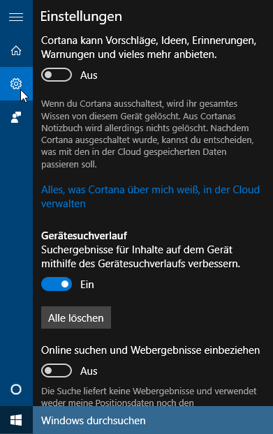 Mit dem Windows 10 Anniversary Update arbeitet Microsoft weiter an seiner digitalen Assistentin Cortana – und am Ruf, es mit dem Datenschutz seiner Benutzer nicht allzu ernst zu nehmen. So fehlen der aktuellen Version Optionen, mit denen sich Cortana einfach deaktivieren und die Suche in der Taskleiste auf das lokale Dateisystem beschränken lässt. Bislang war es möglich, Cortana einfach zu deaktivieren. Dann blieb in der Taskleiste ein einfaches Suchfeld, mit dem man lokal und im Web suchen konnte. Das war insofern ungünstig, als die Funktion der Websuche dafür sorgte, dass alle Suchbegriffe – auch wenn sie sich eigentlich nur auf das lokale Dateisystem bezogen – an Microsofts Suchmaschine Bing übermittelt wurden. Wer das nicht wollte, konnte allerdings die Funktion Online suchen und Webergebnisse einbeziehen ausschalten und suchte dann wirklich nur noch lokal. Beide Optionen fanden sich in den Einstellungen des Suchfelds, wenn man das Feld aktivierte und dann links auf das Einstellungssymbol klickte.