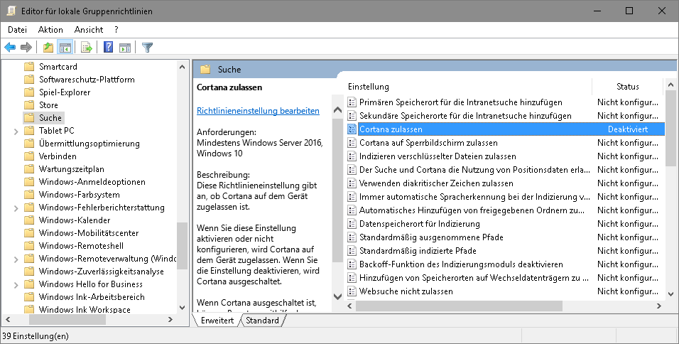 Wer eine Pro-Edition von Windows 10 verwendet, kann Cortana noch relativ komfortabel per Gruppenrichtlinie abschalten: