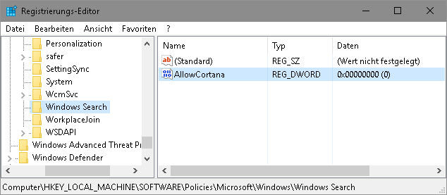 aus, um den Registryeditor zu starten.- Um Cortana für alle Benutzer zu deaktivieren, öffnen Sie darin den Schlüssel HKEY_LOCAL_MACHINE\ SOFTWARE\ Policies\ Microsoft\ Windows\ Windows Search.