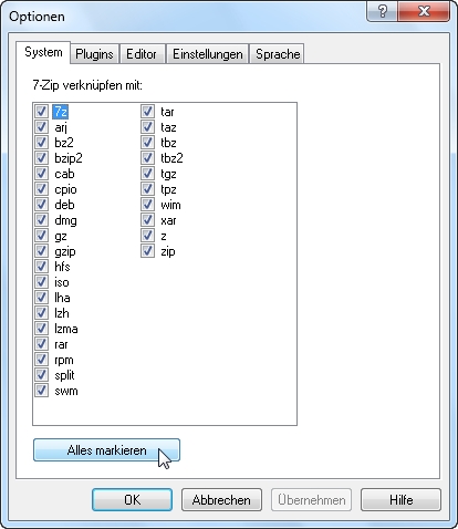 Öffnen Sie mit Extras/Optionen die Einstellungen.- Hier finden Sie in der Rubrik System alle Archiv-Typen, die 7-Zip kennt. Die Häkchen entscheiden darüber, welche es standardmäßig bearbeiten soll.