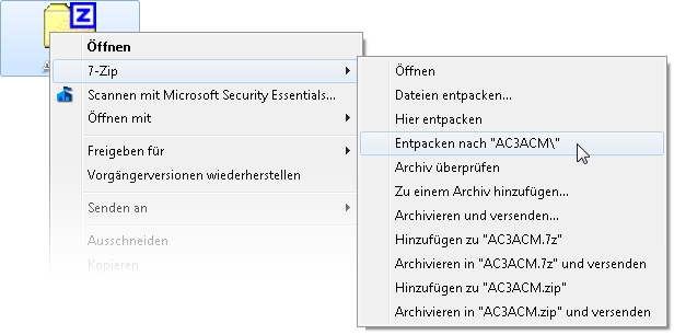 Hier entpacken – das gesamte Archiv wird im selben Ordner entpackt- Entpacken nach „…“ – es wird ein Ordner mit dem Namen der Archivdatei erstellt und der Inhalt des Archivs dort hinein entpackt