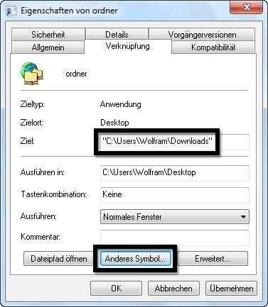 Hier ist üblicherweise bereits das Feld Ziel ausgewählt und dessen Inhalt markiert. Sie brauchen nun nur [Strg] + [V] drücken, um den in Schritt 1 kopierten Pfad zum gewünschten Ordner einzufügen.