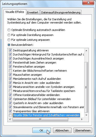 - Für den 3. Bereich: Visuelle Stile für Fenster und Schaltflächen verwenden aktivieren