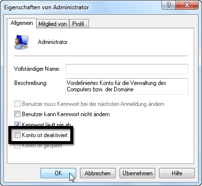 Das kann nur ich gewesen sein, denn sonst arbeitet niemand mit meinem Computer. Ich habe aber nur das Kommando „net user administrator /active:no“ benutzt. Beim Reaktivieren kommt die Meldung „error 5. Zugriff verweigert.“ Ich weiß nicht weiter. Bitte um Hilfe.