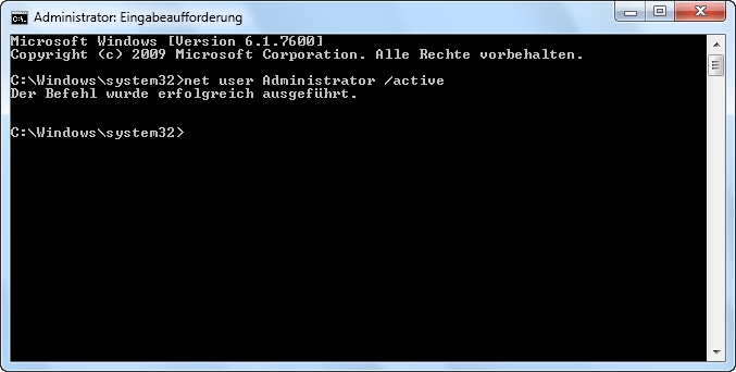 ich versuche unter Win7 Home Premium 32bit (auf Toshiba L500) die Admin Rechte frei zu schalten. Mit oben genannter Vorgehensweise (…net user Administrator /active) funktioniert es nicht, es wird ein Fehler: „Systemfehler 5 aufgetreten Zugriff verweigert“ angezeigt.