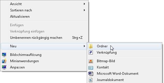 - Klicken Sie dort mit der rechten Maustaste und wählen Sie im Kontextmenü Neu/Ordner.