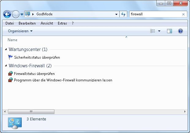 Naja, wer hat sich dafür bloß die Bezeichnung „God-Mode“ einfallen lassen? Immerhin ganz nützlich kann dieses Tool hin und wieder mal sein, besonders wenn man genau weiß, welche Funktion man gerade sucht. Hierzu ein kleiner Tipp: Das Suchfeld rechts oben funktioniert wie bei jedem Explorer-Fenster auch hier wie ein Filter. Wenn Sie da z. B. „Firewall“ eintippen, zeigt die Liste nur noch Einträge an, die mit der Firewall zu tun haben. Auch noch nicht wirklich göttlich, aber immerhin recht praktisch.