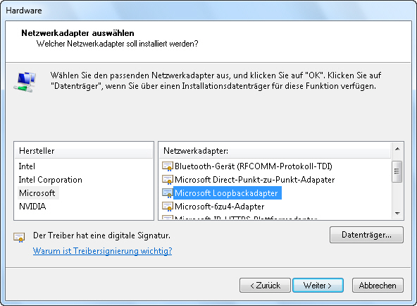 Um auf diese Weise ein virtuelles Gerät zu installieren, wählen Sie den passenden Treiber aus. Einige davon gehören zum Lieferumfang von Windows 7 und sind innerhalb der verschiedenen Hardwaretypen unter dem Hersteller „Microsoft“ einsortiert. So finden Sie einen Netzwerk-Loopback-Adapter unter dem Hardwaretyp Netzwerkadapter beim Hersteller Microsoft unter dem Namen Microsoft Loopbackadapter.