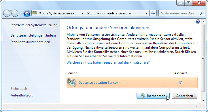 Laden Sie nun die Geosense-Software herunter. Wählen Sie dabei die passende 32-Bit- oder 64-Bit-Version für Ihr Windows 7. Führen Sie die heruntergeladene Datei dann einfach aus, um das Programm zu installieren. Werfen Sie anschließend einen Blick in das Modul Ortungs- und andere Sensoren in der Systemsteuerung. Endlich gibt es hier etwas zu sehen. Wichtig: Aktivieren Sie den Sensor, indem Sie das Häkchen bei Aktiviert setzen und anschließend auf Übernehmen klicken. Erst jetzt ist der Sensor auch aktiv.
