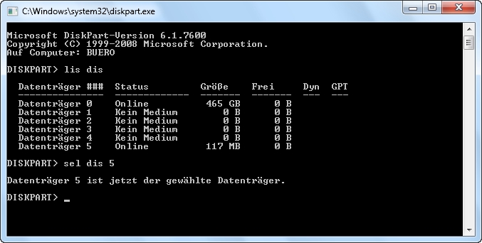 - Geben Sie als nächsten die Anweisung sel dis <Nummer des Laufwerks> (s. o.). Achtung: Gehen Sie hier ganz auf Nummer sicher. Falls Sie versehentlich ein falsches Laufwerk auswählen, könnte das empfindliche Folgen haben!