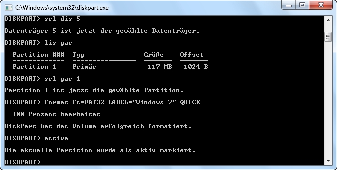 . Sollte es eine Fehlermeldung geben, weil das Gerät in Verwendung ist, ergänzen Sie den Befehl zuformat fs=FAT32 LABEL="Windows 7" QUICK OVERRIDE