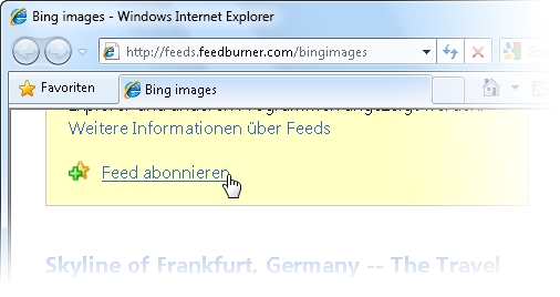 Rufen Sie im Internet Explorer die Adresse http://feeds.feedburner.com /bingimages (oder eben die eines anderen geeigneten Feeds auf.