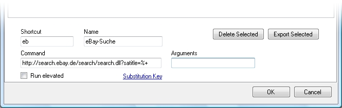 - Der Platzhalter legt fest, wie der Parameter, den Sie dem Kurzbefehl im Startmenü mitgeben, in das Kommando integriert wird. Wir verwenden dafür den Code %+. Er hängt an die Webadresse alle angegebenen Parameter an, wobei mehrere Parameter jeweils mit einem Pluszeichen kombiniert werden. In dieser Form erwarten die Suchfunktion von eBay und auch viele andere Suchhilfen im Web die Suchbegriffe. Über weitere Varianten beim Platzhalter können Sie sich mit Substitution Key informieren.