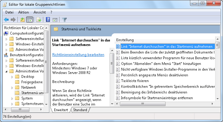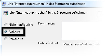 Wählen Sie hier mit einem Doppelklick die Einstellung Link “Internet durchsuchen“ in das Startmenü aufnehmen zum Bearbeiten aus.