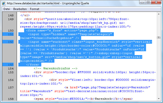 Für unser Beispiel basteln wir ein kleines Suchgadget, das uns eine Online-Suche direkt auf den Bildschirm holt. Da es schon genug fertige Gadgets für Google, Yahoo, Wikipedia und Co. gibt, machen wir mal etwas Exotischeres. Dazu rufen wir einfach eine Webseite auf, deren Suchfunktion wir als Gadget haben möchten, und kopieren uns den HTML-Code für das Suchformular dort heraus. Das geht ganz einfach, indem wir uns im Internet Explorer mit Ansicht/Quelle den HTML-Code der Seite anzeigen lassen und dort das Suchformular lokalisieren. Den Code speichern wir in einer eigenen HTML-Datei mit einem beliebigen Namen. Wichtig ist nur, dass genau dieser Name in der Manifestdatei bei
