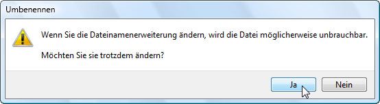 Bestätigen Sie den Hinweis, dass die Datei durch die andere Erweiterung möglicherweise unbrauchbar wird, mit Ja. Selbstverständlich wird die Datei nicht unbrauchbar, sondern es wird eine Datei vom Typ Windows-Minianwendung.