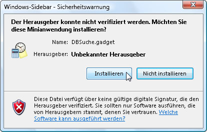 Windows bietet Ihnen dann an, die darin enthaltene Minianwendung zu installieren. Klicken Sie dazu auf die Installieren-Schaltfläche. Der Hinweis auf Risiken durch unbekannte Herausgeber ist prinzipiell berechtigt. Aber wenn das Gadget selbst gemacht ist, sollte das in diesem Fall kein Problem sein.