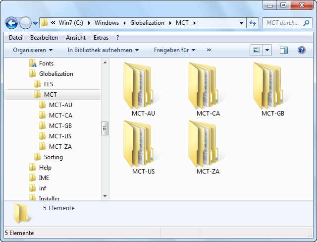 Starten Sie den Windows Explorer und öffnen Sie den Pfad C:\ Windows\ Globalization\ MCT. Wichtig: Diese Dateien sind nur sichtbar, wenn der Windows Explorer so konfiguriert ist, dass auch versteckte und Systemdateien angezeigt werden.
