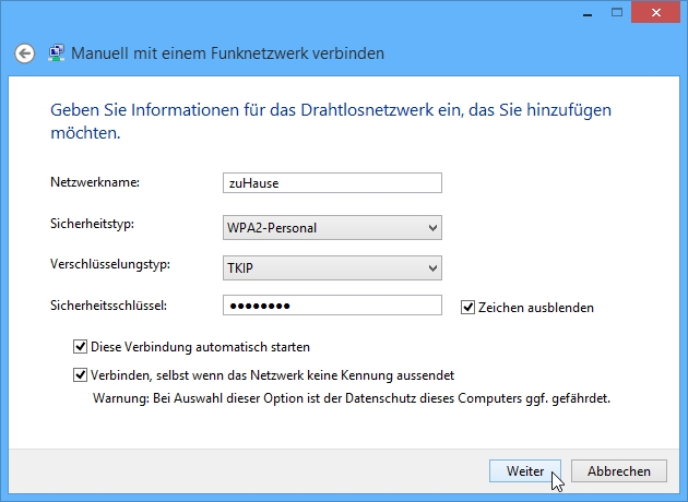 Windows 8: Bei versteckten WLANs ohne Kennung (SSID) anmelden