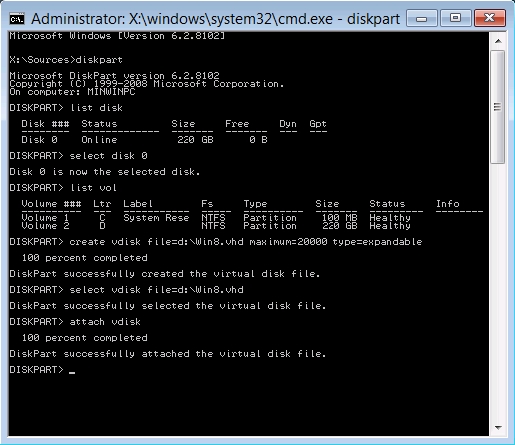create vdisk file=<Laufwerk>:\<Name>.vhd maximum=20000 type=expandable + für <Laufwerk> geben Sie den zuvor ermittelten Laufwerksbuchstaben an + für <Name> tippen Sie einen einfache, aussagekräftigen Dateinamen ein + maximum gibt die maximale Größe in MB der virtuellen Festplatte an. Sie sollte mindesten 20 GB betragen, + also 20000 MB. Größer geht immer, aber den verfügbaren freien Platz sollten Sie nicht überschreiten. +type=expandable legt fest, dass die Datei nur nach Bedarf wächst. Zunächst ist sie also praktisch leer und erst mit dem Installieren von Windows 8, dem Erstellen von Dateien usw. wächst sie nach und nach bis zur maximalen Größe an. Das Erstellen der Datei für die virtuelle Festplatte dauert ggf. etwas. Warten Sie die Erfolgsmeldung ab.