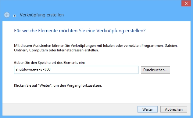 Klicken Sie zunächst mit der rechten Maustaste auf eine beliebige freie Stelle des klassischen Desktops und wählen Sie dann im Kontextmenü die Funktion Neu/Verknüpfung.- Geben Sie im anschließenden Dialog anstelle einer Datei oder eines Programms den Befehl shutdown.exe –s –t 00 ein. Er startet das windows-eigene Programm shutdown.exe mit Parametern, die für das Herunterfahren des Systems sorgen.