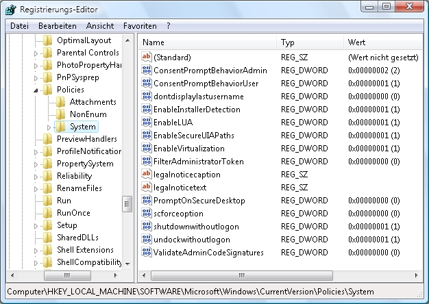 Öffnen Sie im Registrierungs-Editor den Schlüssel HKEY_LOCAL_MACHINE \SOFTWARE \Microsoft \Windows \CurrentVersion \Policies \System.- In der rechten Hälfte des Programmfensters werden nun eine Reihe von Einstellungen angezeigt, mit denen Sie das Verhalten der Benutzerkontensteuerung beeinflussen können.