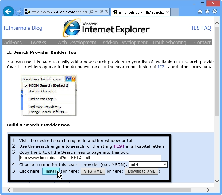 - Rufen Sie nun im Internet Explorer die Webseite www.enhanceie.com/ie/searchbuilder.asp auf. Damit öffnen Sie ein Formular zum Erstellen eines individuellen Suchanbieters.