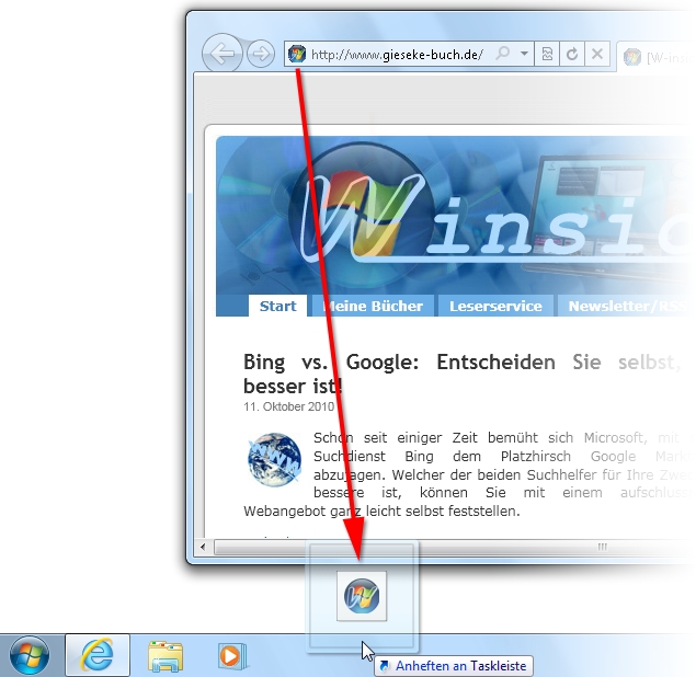 3. ie9_0503Lassen Sie die Maustaste nun los. In der Taskleiste wird ein Symbol für diese Website eingefügt. Dieses bleibt auch erhalten, wenn Sie das Internet Explorer-Fenster mit der Website schließen.